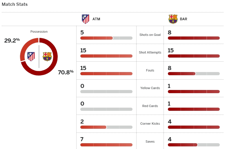 จบเกม แอตเลติโก้ มาดริด เปิดบ้านแพ้ บาร์เซโลน่า 1-2 แต่สกอร์ผ่านเข้ารอบรองชนะเลิศ ด้วยสกอร์รวม 3-2
