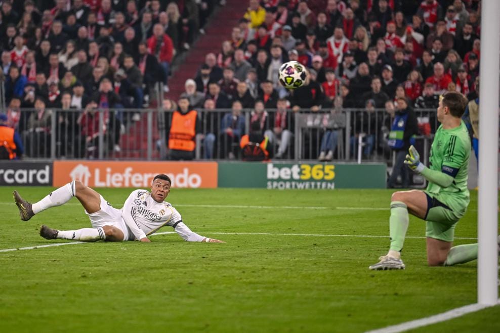 กลับมาเป็นโอกาสของ มาดริด หลังจากเพรสซิ่งจนดักบอลได้ในแดนของ บาเยิร์น แล้วรีบจ่ายเข้าเขตโทษให้ เอ็มบาปเป้ โฉบมามุมแคบทางซ้ายสับไกยิงออกเสา แต่สุดท้ายยังมีธงล้ำหน้าตามมา