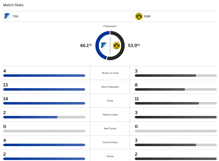 สุดท้ายไม่รอดสำหรับ โบรุสเซีย ดอร์ทมุนด์ ที่โดนนำจากจุดโทษที่กรรมการย้อนกลับมาแจกหลังเช็คภาพช้า แล้วถึงแม้จะได้ เซห์รู กีราสซี่ ตีเสมอท้ายเกมแต่พอทดเจ็บ เสือเหลือง มาเสียจุดโทษจากแฮนด์บอลอีกเลยพ่ายต่อ ฮอฟเฟ่นไฮม์ 2-1 เป็นการแพ้ 2 เกมติดต่อกัน