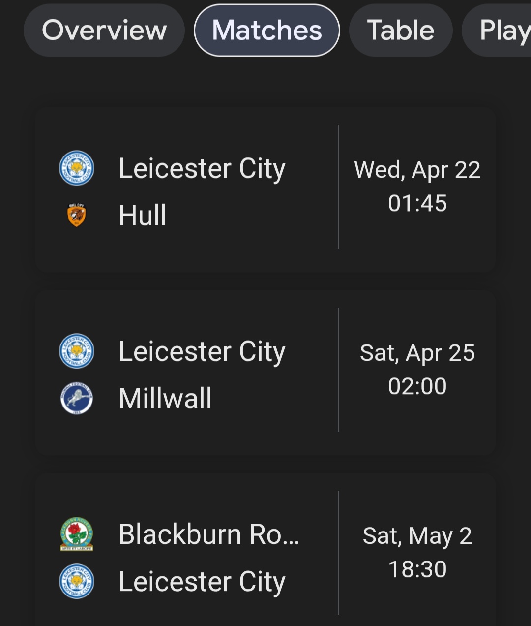 รอดยาก แต้มห่างเกิน ตอนนี้เวสต์บรอมวิชบุกนำเปรสตันอยู่ 1-0 ถ้าจบแบบนี้ เวสต์บรอมวิช จะหนีไปไกล 49 แต้มเลย ต้องแช่งให้เวสต์บรอมวิชไม่ชนะ เสมอหรือแพ้ก็ได้ แต้มจะอยู่ที่ 46-47 แต้ม แล้วเลสเตอร์ต้องชนะ 3 นัดสุดท้ายทุกนัด แล้วแช่งให้เวสต์บรอมวิชไม่ชนะทุกนัด มันเป็นไปได้ยาก หรือเป็นไปไม่ได้เลย แล้ว 3 นัดสุดท้ายของเลสเตอร์ เจอทีมในกลุ่มลุ้นเลื่อนชั้น 2 ทีม มิลล์วอลล์, ฮัลล์ ซิตี้ ฟอร์มเลสเตอร์หมาไม่แดกแบบนี้ ไม่รู้จะเอาอะไรไปชนะเขาได้