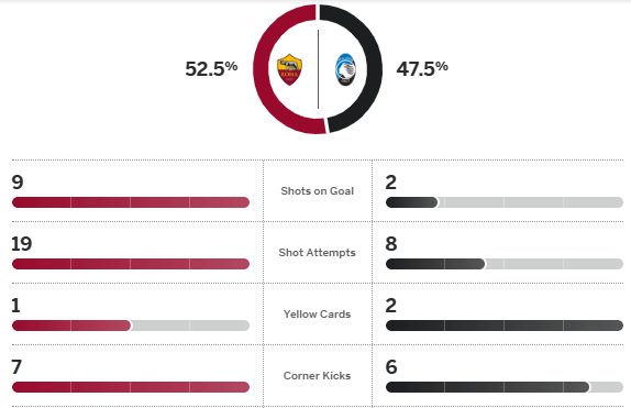 โรม่า โดนนำนาที 12 แล้ว มาริโอ เอร์โมโซ่ แนวรับช่วยยิงตีเสมอก่อนจบครึ่งแรก จากนั้นครึ่งหลังมีโอกาสพลิกแซงหลายครั้งแต่ไม่ผ่านมือ มาร์โก้ คาร์เนเซ็คคี่ โกล์คู่แข่ง สุดท้ายได้แค่เปิดบ้านเจ๊า อตาลันต้า 1-1 พลาดโอกาสทำแต้มเท่าพื้นที่ท็อปโฟร์ก่อน ยูเวนตุส ลงแข่งพรุ่งนี้