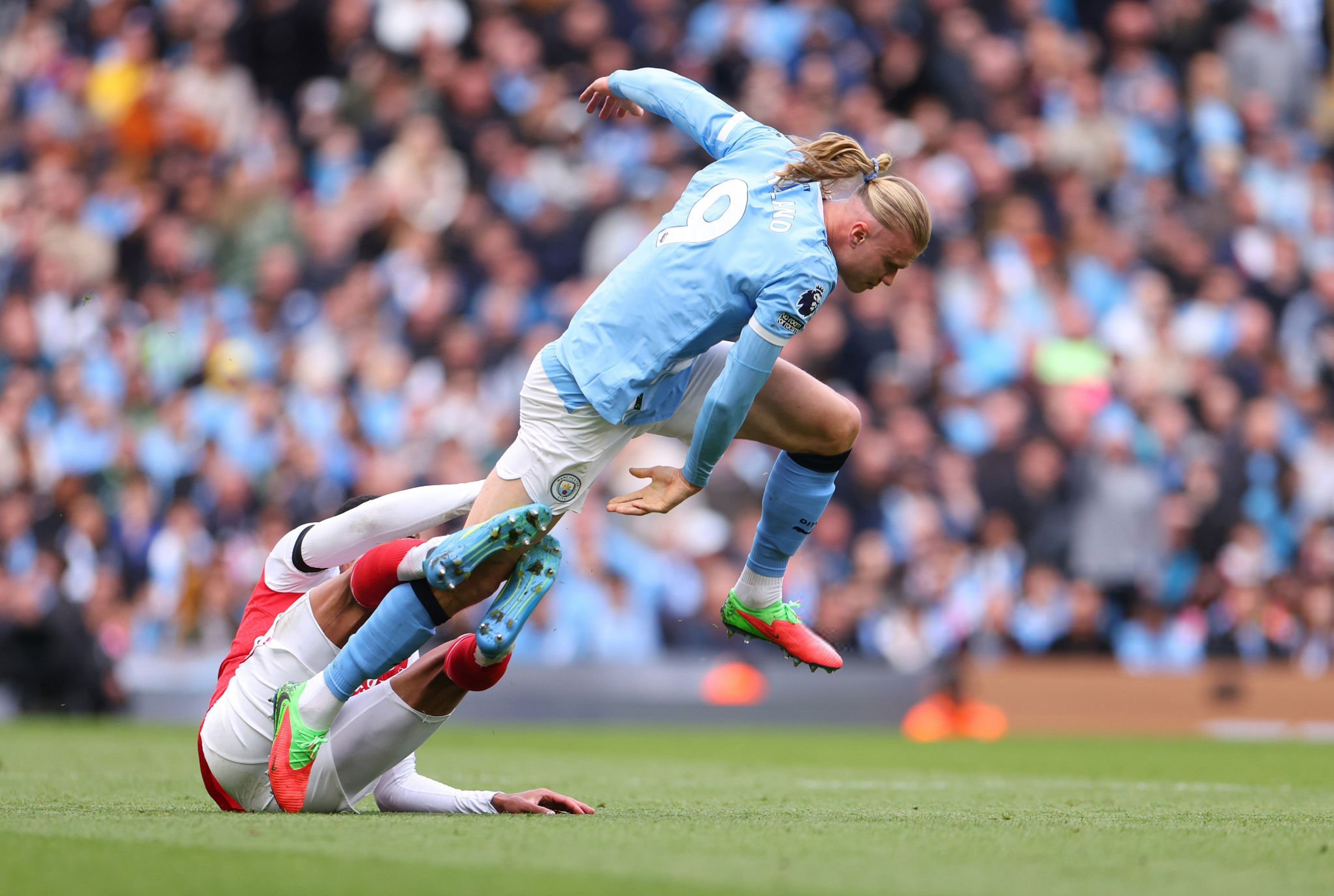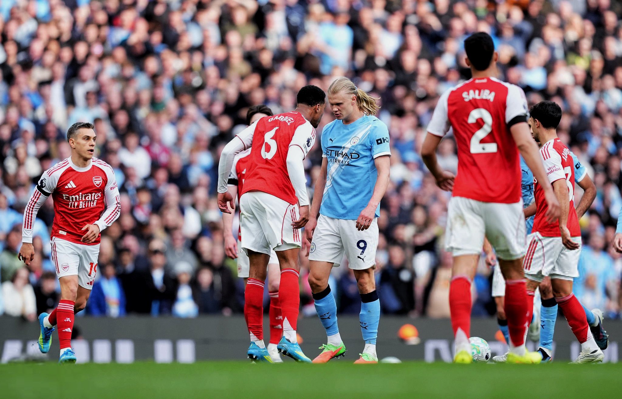 บิ๊กแมตช์ตัดสินแชมป์ สมราคาคู่หยุดโลก แมนเชสเตอร์ ซิตี้ เปิดบ้านปะทะ อาร์เซนอล ถึงพริกถึงขิง ห่ำหั่นชิงไหวชิงพริบกันตลอดทั้งเกม ก่อนสุดท้ายเป็น เออร์ลิ่ง ฮาลันด์ ที่เอาชนะการตามประกบแบบถึงลูกถึงคนของ กาเบรียล มากัลเญส ซัดประตูชัย 2-1 นาทีที่ 65 พาทีมเรือใบได้ผลการแข่งขันที่ต้องการ จี้ติดทัพปืนใหญ่ จ่าฝูง เหลือห่างแค่ 3 คะแนนเท่านั้น แถมยังเล่นน้อยกว่า 1 นัดด้วย