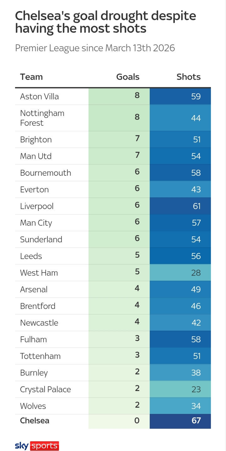 ตั้งแต่ 13 มีนา เชลซี shot ( ง้างเท้ายิง ) ไป 67 ครั้งมากสุดในลีก แต่ได้ 0 ประตู
