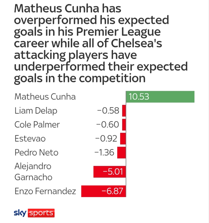 Matheus Cunha has overperformed his expected goals in his Premier League career while all of Chelsea's attacking players have underperformed their expected goals in the competition
