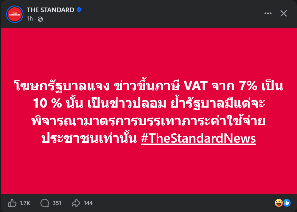 [RE: โฆษกรัฐบาลแจง ข่าวขึ้นภาษี VAT จาก 7% เป็น 10 % นั้น เป็นข่าวปลอม]