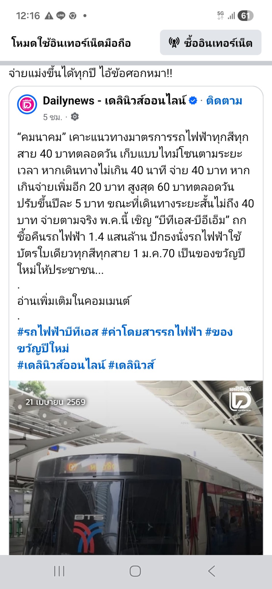 [RE: กระทรวงคมนาคมเคาะรถไฟฟ้าเก็บ 40 บาท ไม่เกิน 40 นาที เกินเวลาเก็บ 60 บาท เก็บเพิ่ม 5 บาท ทุกปี]