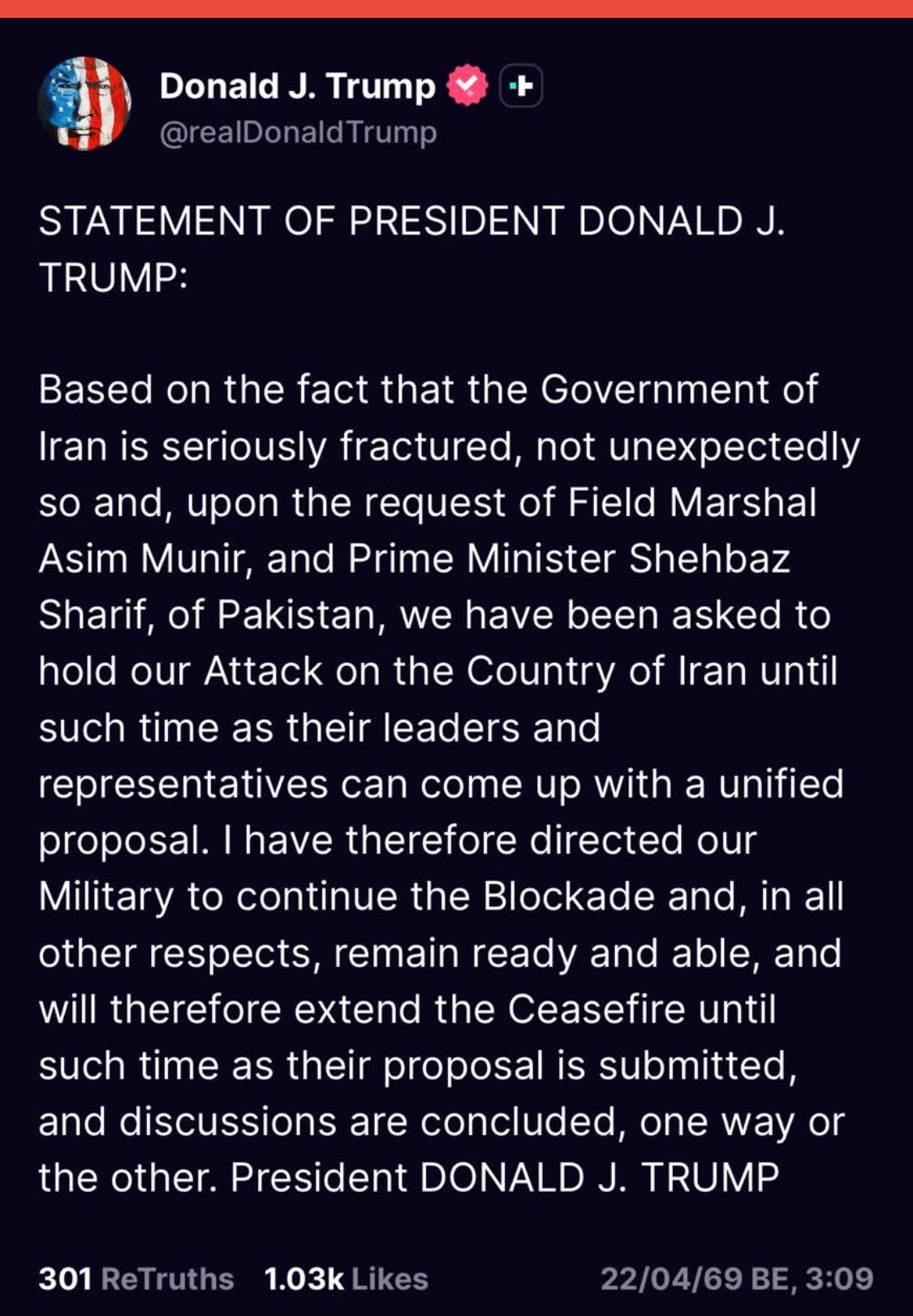 วันที่ 22 เม.ย.69 เวลา 03.09 น. โดนัลด์ ทรัมป์ ประธานาธิบดีสหรัฐอเมริกา โพสต์ คำแถลง