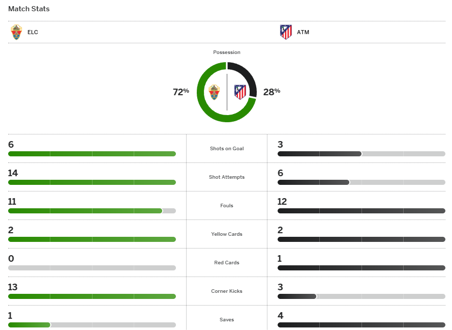 แอตเลติโก้ มาดริด ยังเป๋ต่อไปหลังออกนำก่อนแต่ก็โดนแซงคืนแล้วต้องมาเหลือ 10 คนเพราะ ธิอาโก้ อัลมาด้า โดนใบแดงและถึงแม้ นิโก้ กอนซาเลซ จะทำประตูเพิ่มช่วยทีมตีเสมอ แต่สุดท้ายก็เอาไม่อยู่ ตราหมี พ่ายต่อ เอลเช่ 3-2 แพ้ไป 7 จาก 8 เกมหลังสุดในทุกรายการ