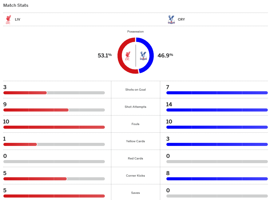 ลิเวอร์พูลยังวางนักเตะชุดเดิมลงสนามเว้นเพียงเฟร็ดดี้ วู้ดแมน ที่ประเดิมตัวจริงในเกมลีกนัดแรกให้สโมสร อเล็กซานเดอร์ อิซัค ยังยืนหน้าเป้าต่อไป ด้านคริสตัล พาเลซ ส่งอิสไมลา ซาร์ ตัวแสบลงสนามอยู่ด้านหลังฟิลิปป์ มาเตต้า แล้วมีเบรนแนน จอห์นสัน ช่วยเกมรุกอีกคน