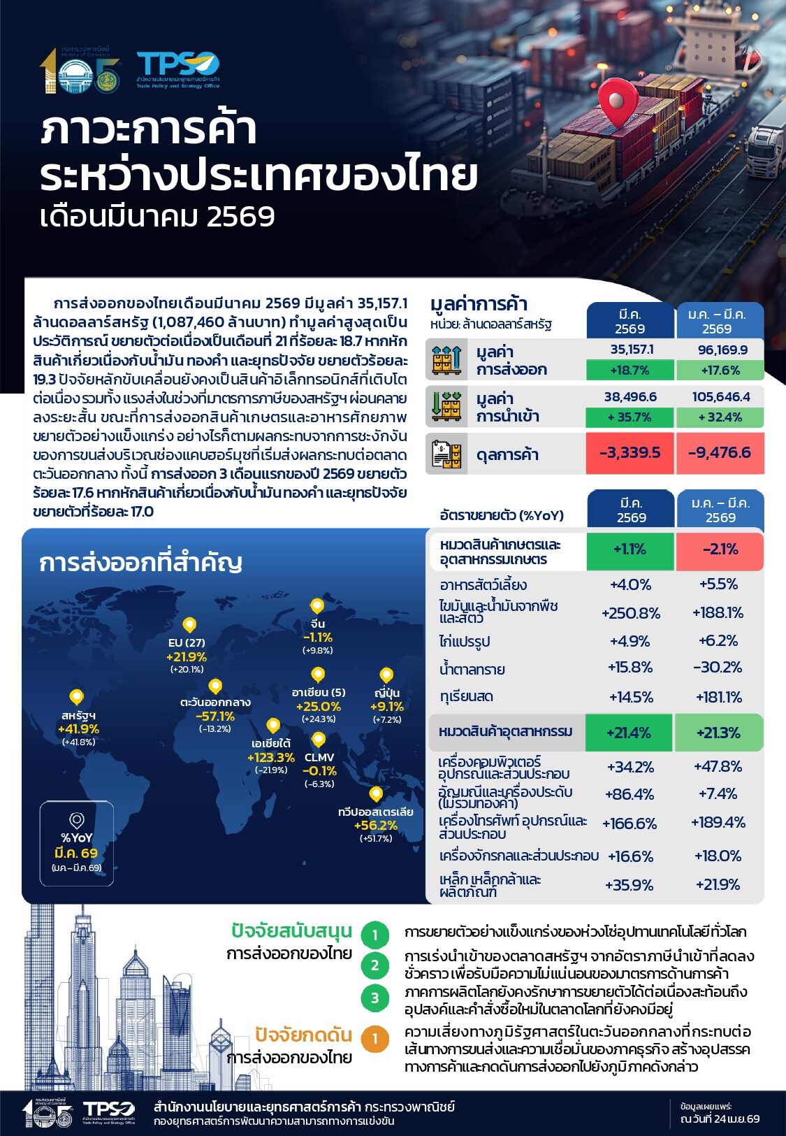 ก.พาณิชย์แจ้ง ส่งออกไทย มีนาคม สูงสุดเป็นประวัติการณ์ โต 18.7% มูลค่า 35,157 ล้านดอลลาร์