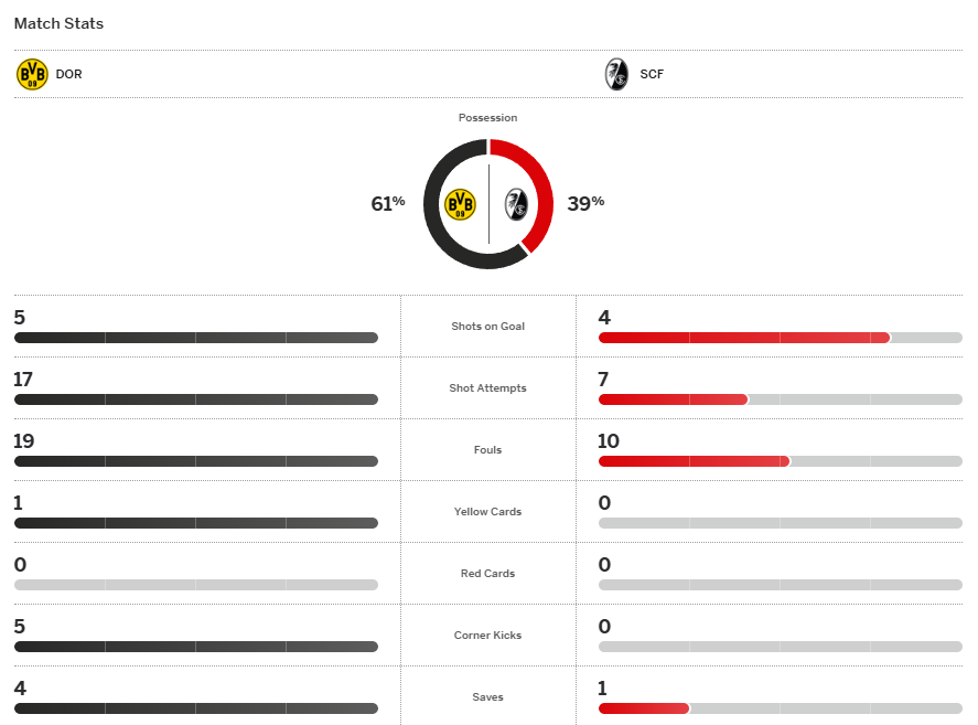 จบเกม ดอร์ทมุนด์ เอาชนะ ไฟรบวร์ก ไปอย่างไม่ยากเย็น 4-0 กลับมาคว้าชัยหลังสะดุดแพ้ไป 2 นัดติดก่อนหน้านี้และกลับไปนำ ไลป์ซิก 5 แต้มเพื่อจบฤดูกาลในฐานะรองแชมป์