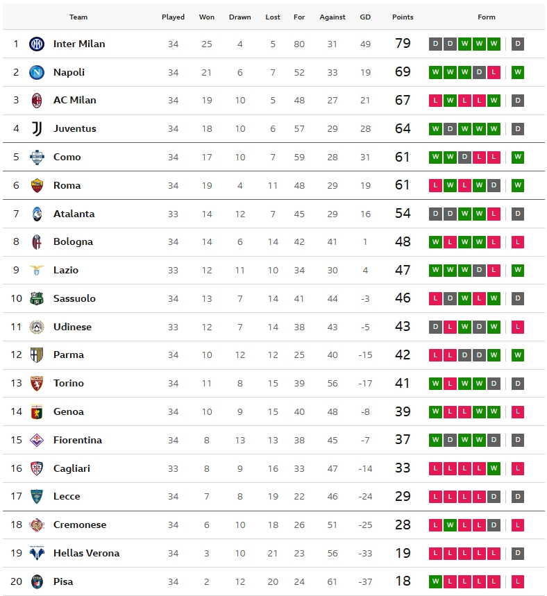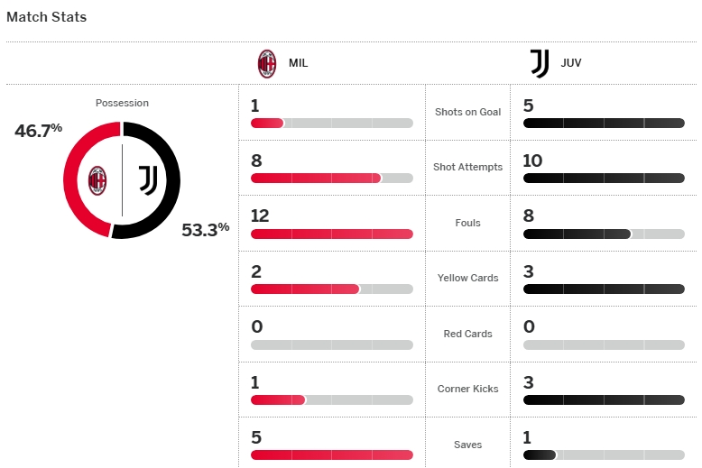 เกมบิ๊กแมตช์ระหว่าง เอซี มิลาน กับ ยูเวนตุส ทำอะไรกันไม่ได้ แม้มีจังหวะส่งบอลเข้าประตูของ เคเฟรน ตูราม แต่ VAR ก็จับล้ำหน้า ทีมเยือนหาโอกาสยิงได้มากกว่าแต่ไม่สามารถเปลี่ยนเป็นสกอร์ได้ จบเกมเลยเสมอกันไป 0-0 ทำให้อันดับในตารางของทั้งคู่ก็ไม่เปลี่ยนแปลง อยู่ที่ 3 และ 4 ตามลำดับ