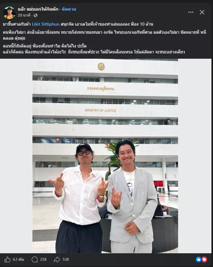 อ่ออ ก็ว่ามาทำอะไร มากันทั้งแก๊งเลยปัจจุบัน แต่เอาจริงๆ ปกติฟ้อง ตัวโจทก์ไม่ค่อยมาศาลกันนะ เขาส่งทนายมากันทั้งนั้นแหละ สุดท้ายรอคำสั่งศาลทุกคดีนี่แหละ ไม่กล้าตัดสินใคร บทเรียนเยอะเกิน